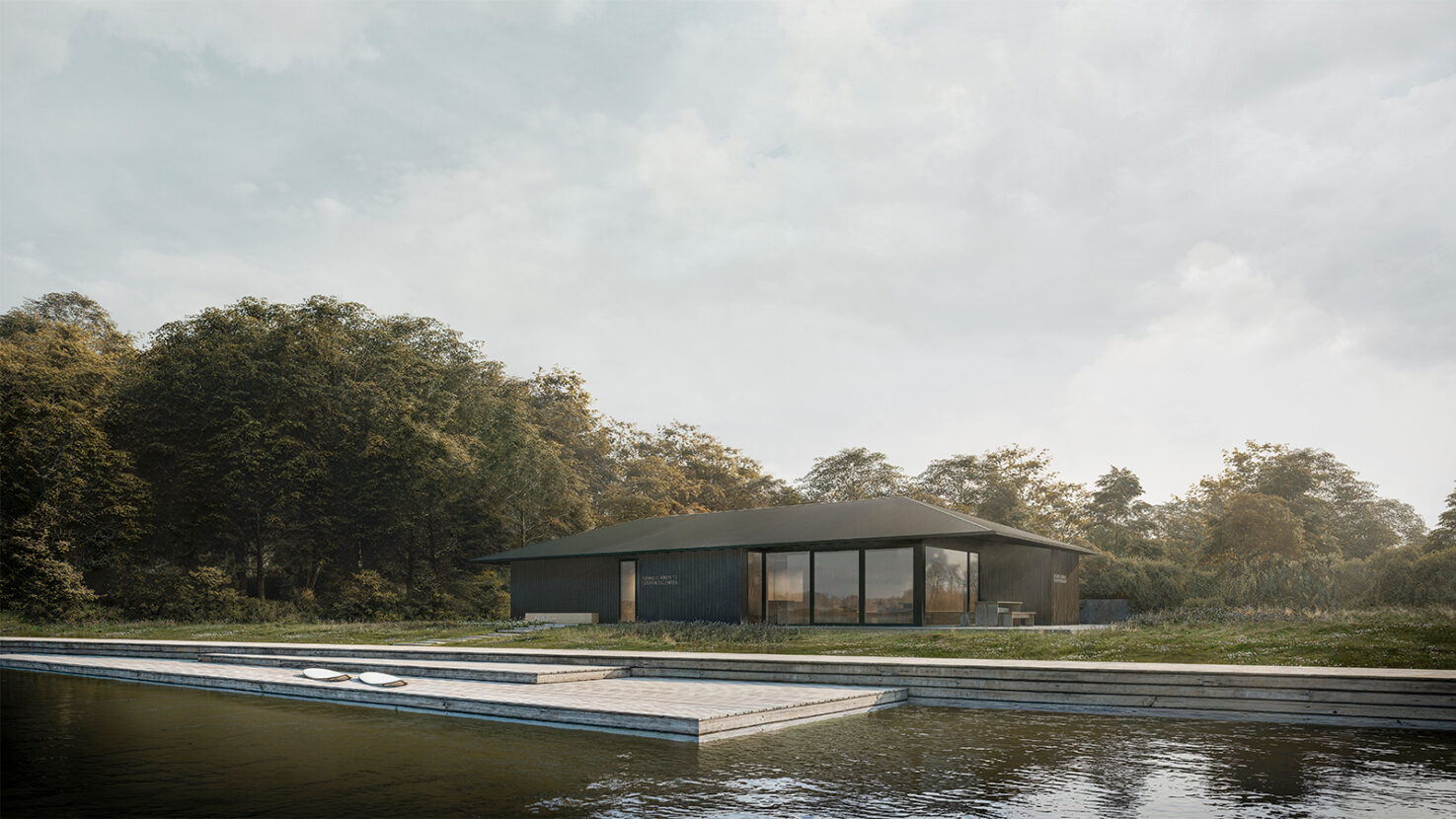 Med udgangspunkt i det nuværende klubhus’ placering etableres en ny bebyggelse, der med en dynamisk og skarptskåret geometri og mørke facader markerer sig tydeligt i landskabet. Den karakteristiske tagskive og de store vinduespartier mod ankomst og søen inviterer folk ind og skaber en naturlig overgang mellem husets funktioner og de nære udearealer og aktivitetszoner. Dette sikrer en sammensmeltning af indendørs og udendørs oplevelser, hvilket fremmer både sociale og sportslige aktiviteter.
