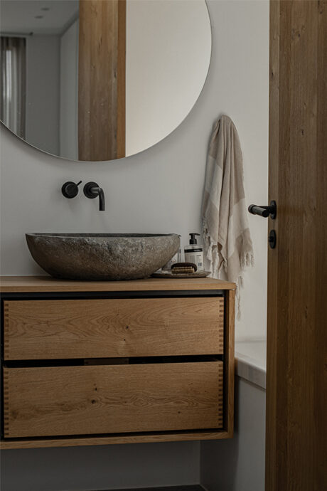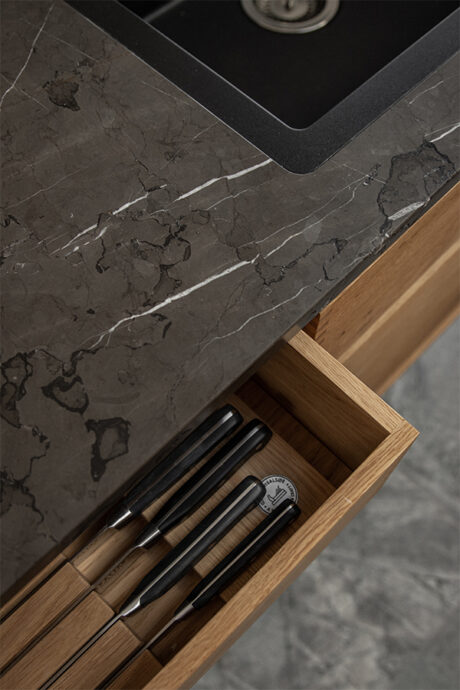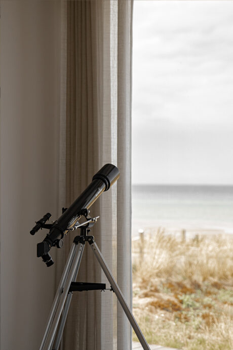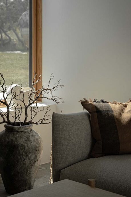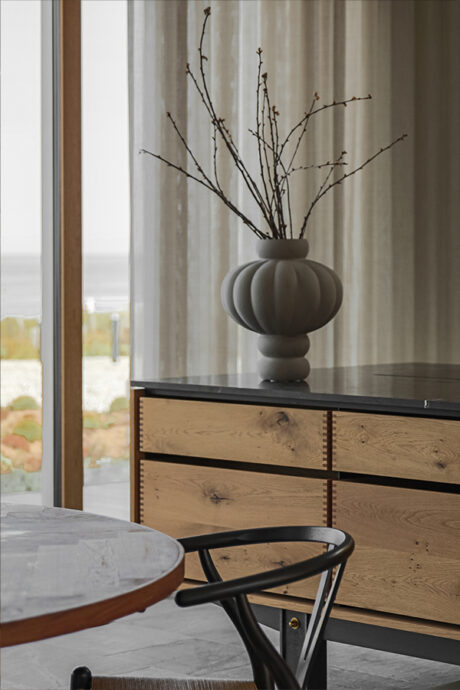 House Of yards interiør er et fint sammenspil mellem natursten og egetræ.I interiøret i sommerhuset er der arbejdet med flader, der former lys og skaber et blødt, organisk landskab for øjet. Overfladerne i eg og natursten i sammenspil med lys, de forskellige kig til naturen og rene linjer er med til at tilføre sommerhuset en gennemført æstetisk sanselig oplevelse.
