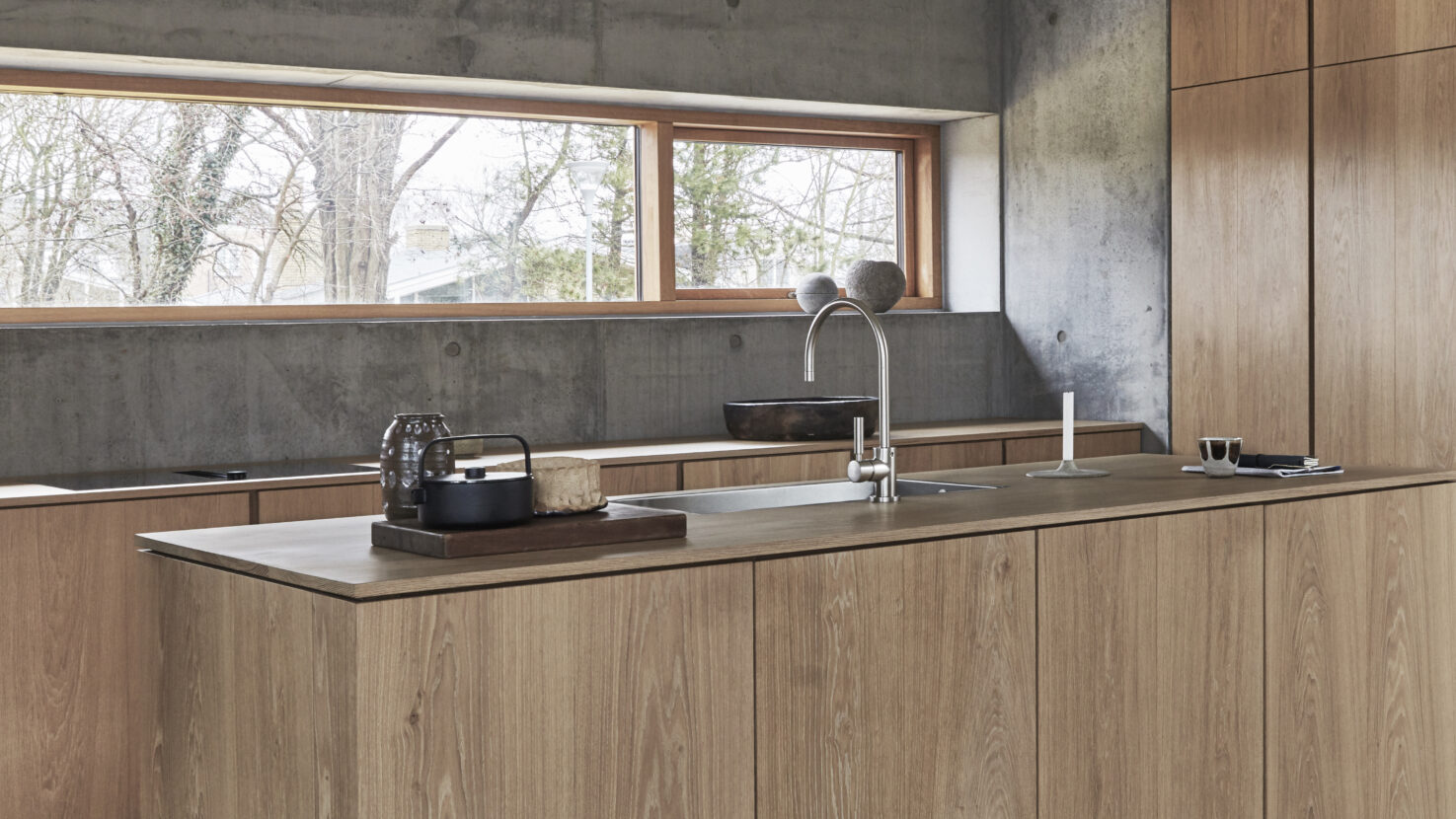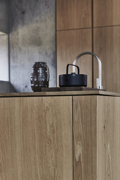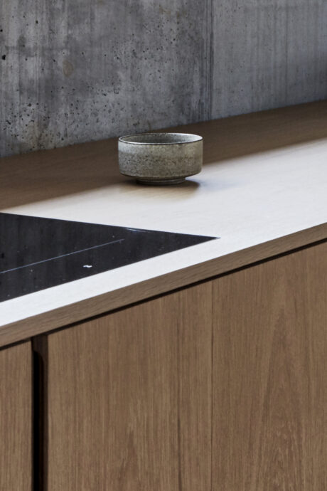 Vores snedkerkøkken Layer i arkitekt Rasmus Baks private hjem. Huset er en harmonisk fusion af japansk minimalisme og skandinavisk æstetik, hvor materialer som egetræ og rå beton skaber et forenklet og elegant udtryk. Her understreger Layer-køkkenet Rasmus’ stærke vision om at skabe skabe et roligt og afbalanceret køkken.