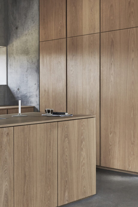 Til lågerne anvendes produktserien Dinesen Layers, hvis naturlige skønhed og unikke åretegninger understøtter køkkenets vertikale design.