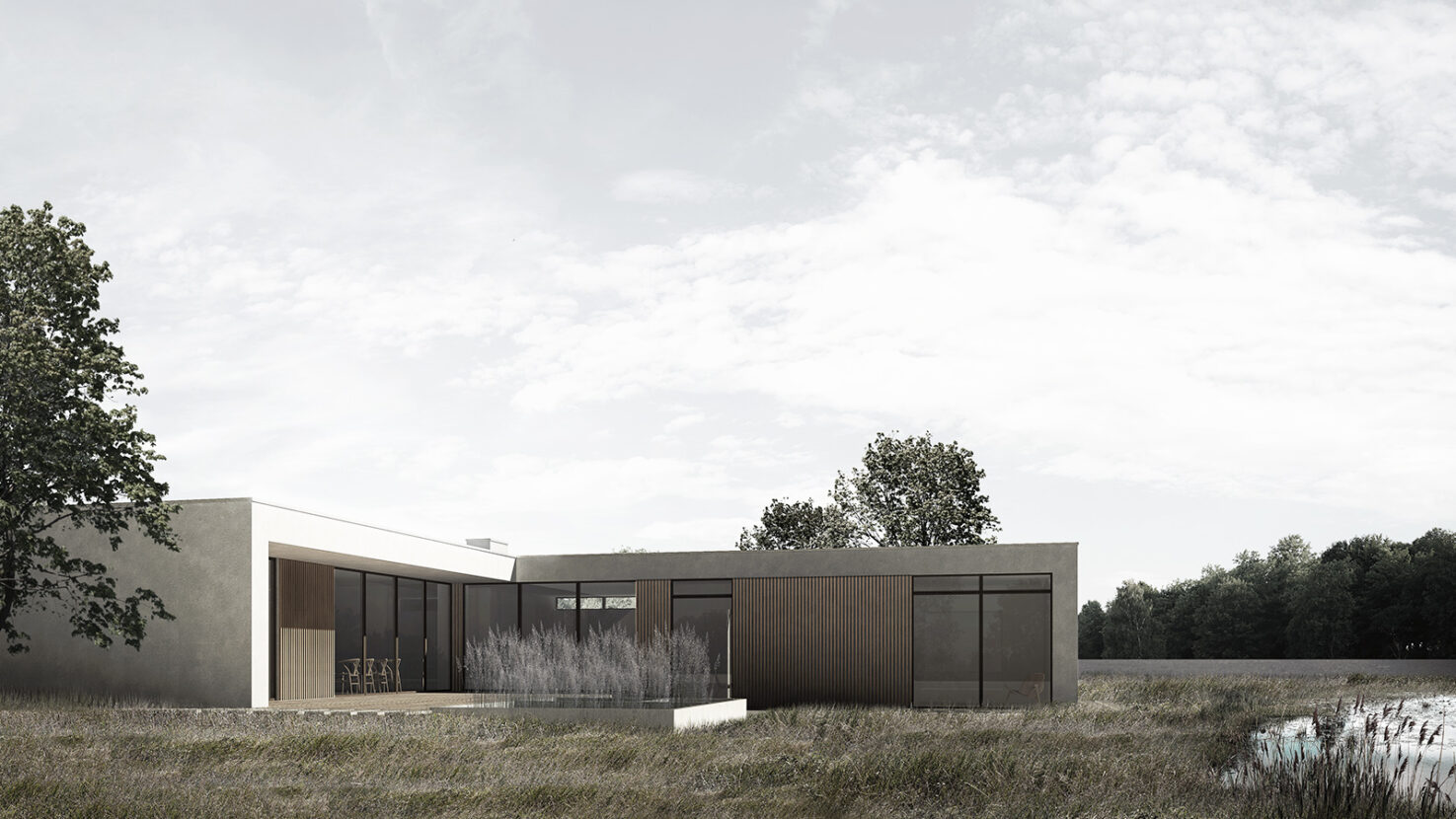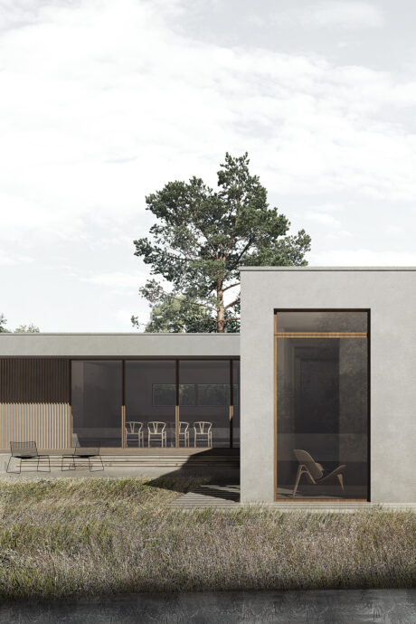 Som et vinkelhus placerer Angle House sig på grunden og åbner sig op med store vinduespartier ud mod søen. Den rå beton blødes op med træpaneler og vinduesrammer i træ.