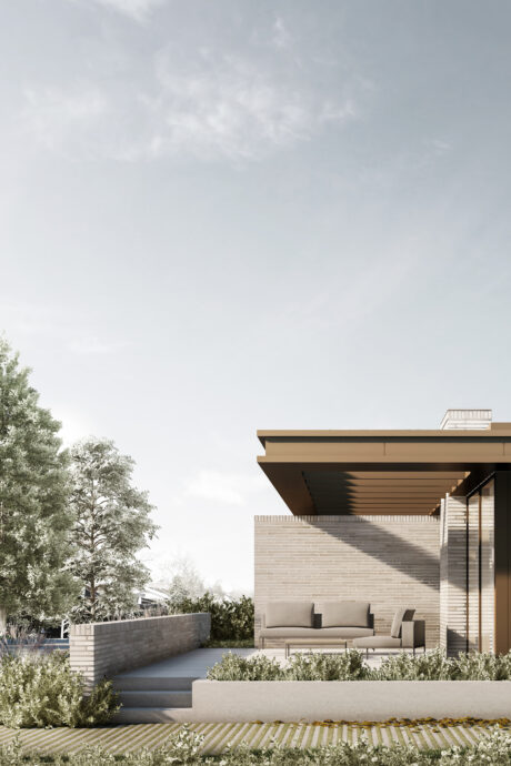 Tilbagetrukket på grunden er de sekundære rum placeret, således gavner værelserne og den skærmede masterafdeling af den øgede privathed af tilbagetrækningen samt de store flotte træer på grunden. Shell House fremstår i langstrakte tegl som underbygger længderetningen på villaen, kun afbrudt af den skønne atriumgård og terrasseområder.