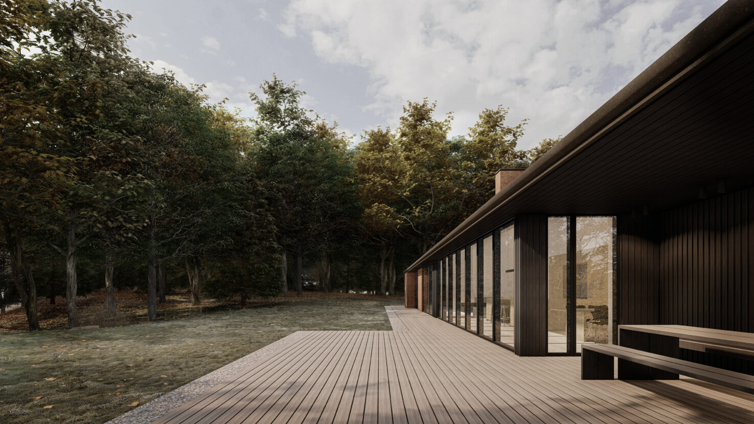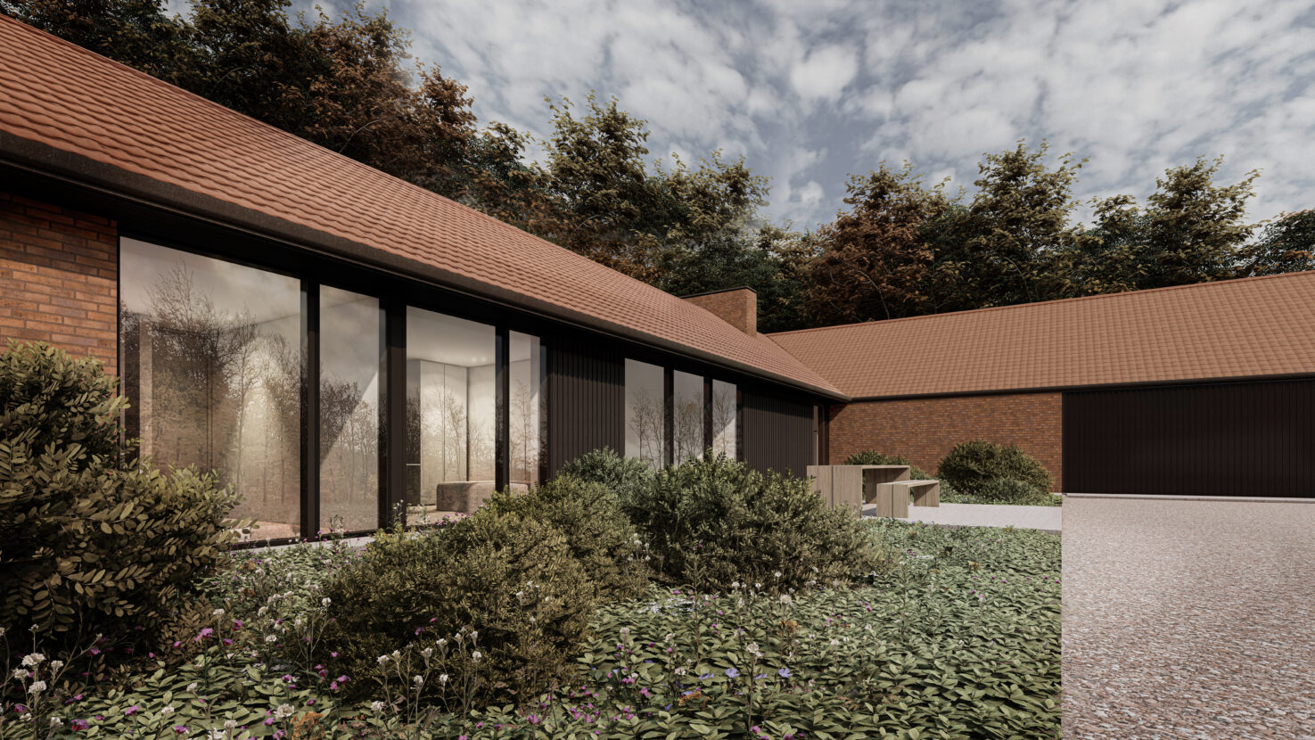 På en ugeneret grund der grænser majestætisk ud til skoven, ligger Skovhytten. Et tolænget moderne landsted, der trækker på de klassiske landlige typologier, for at skabe et gennemlyst hus, med fokus på samvær og en tilværelse i pagt med naturen. De to sammenkoblede længer definerer med sin volumen et afgrænset gårdrum – i kontrast med den omkringliggende vilde natur. Den klassiske materialepalette med brændte rød-brune tegltag og murfacade, sætter stemningen om det forenklede liv i kontakt med jagt og skov.