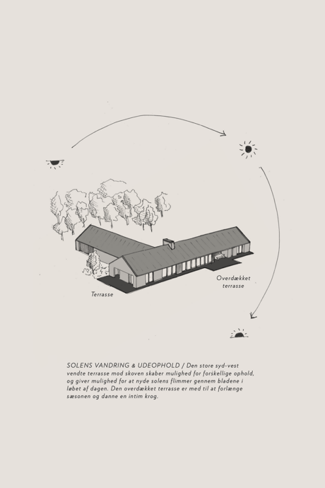 Stuehusets hjerterum, køkken-alrummet, spænder på tværs af hele husets bredde, og åbner op mod skoven i vest og morgenterrassen i øst. Herfra skabes en nærhed til naturen, hvorfra sæsonerne kan følges tæt. Husets stue, master soveværelse samt kontor er orienteret mod skoven i vest, mens værelserne og ankomsten er orienteret mod øst. Skovhytten vil danne rammerne for dagligdagen, med plads til hele familien, store samkomster, de rolige aftenener og jagt ture i skoven.