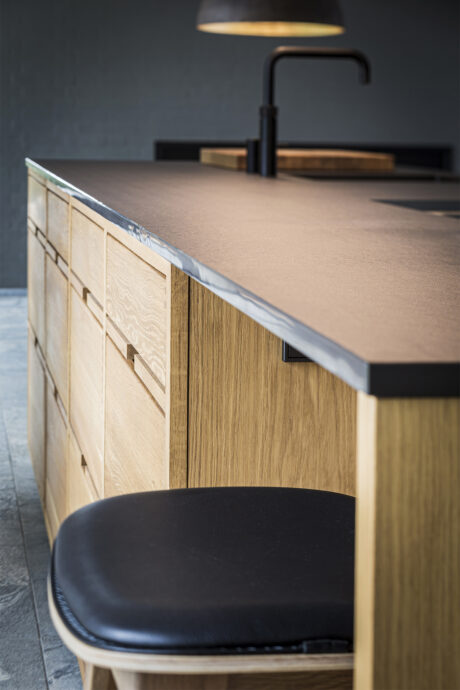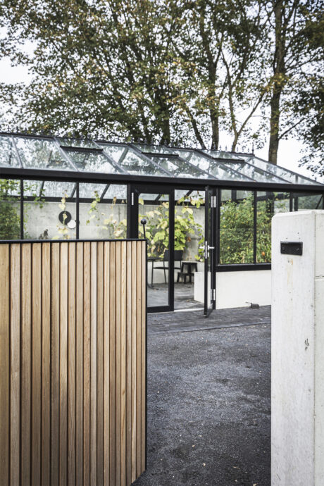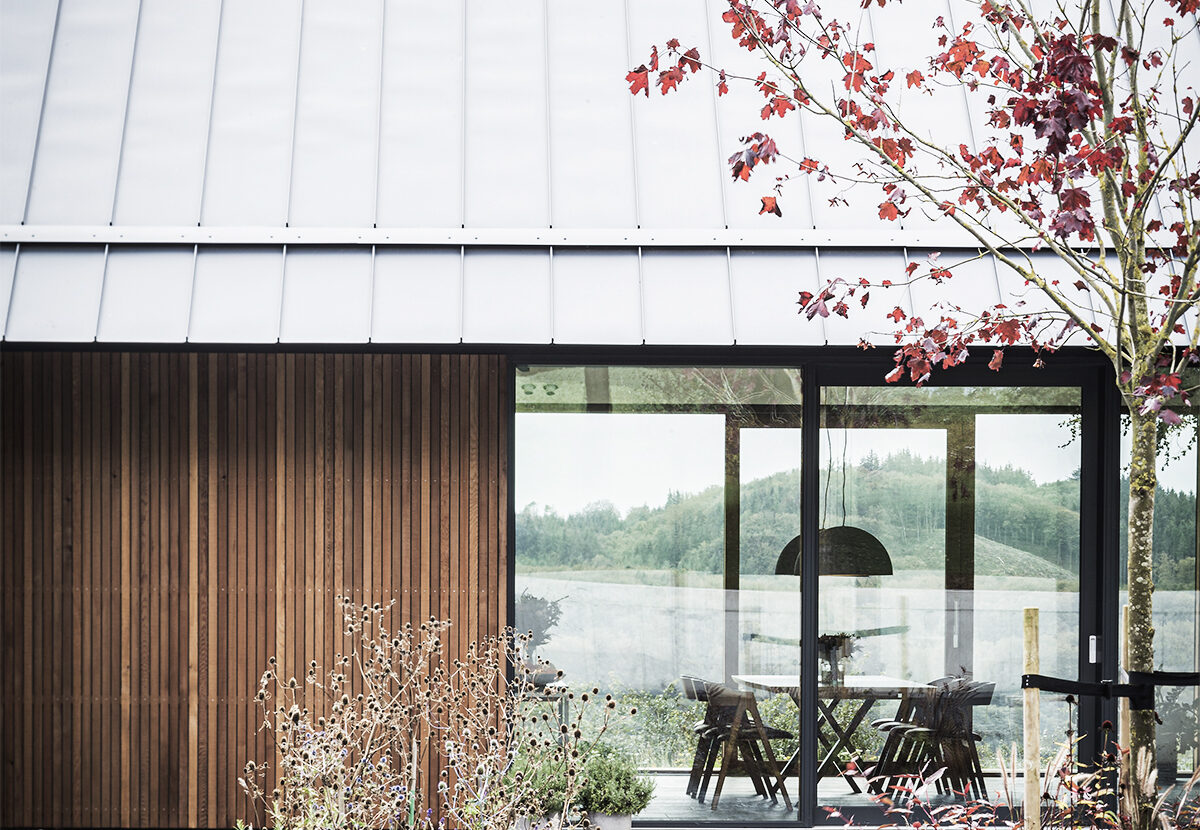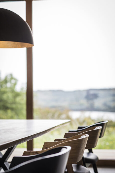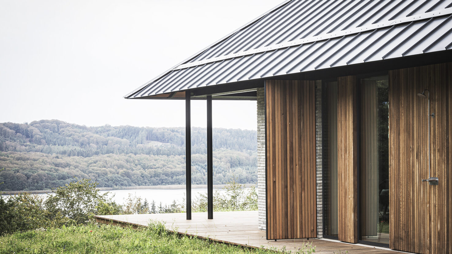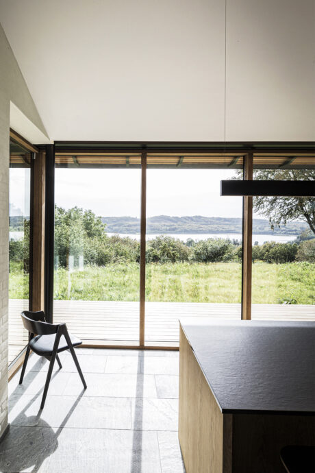 På en enestående grund med uforstyrret kig ud naturområder, ligger denne smukke trelængede bygning med grå flensborg mursten, listepartier og synlige spær under det stramme tagudhæng. Fra ankomsten er bygningen solidt plantet i landskabet, mens den mod udsigten hæver sig over terrænet med en svævende træterrasse på pæle, der trækker referencer fra orientens lette strukturer.