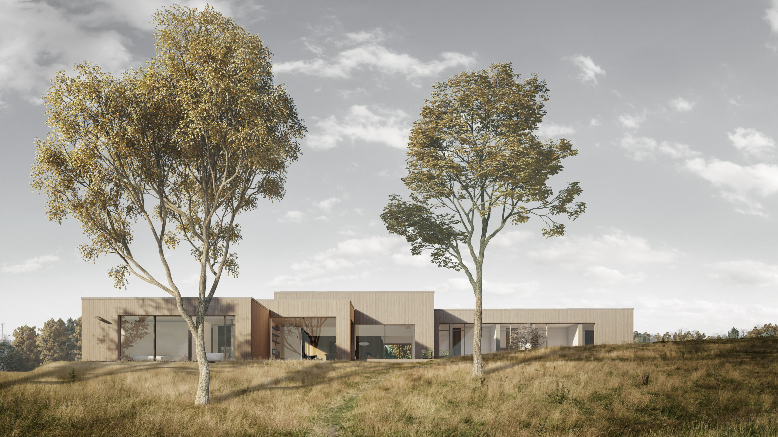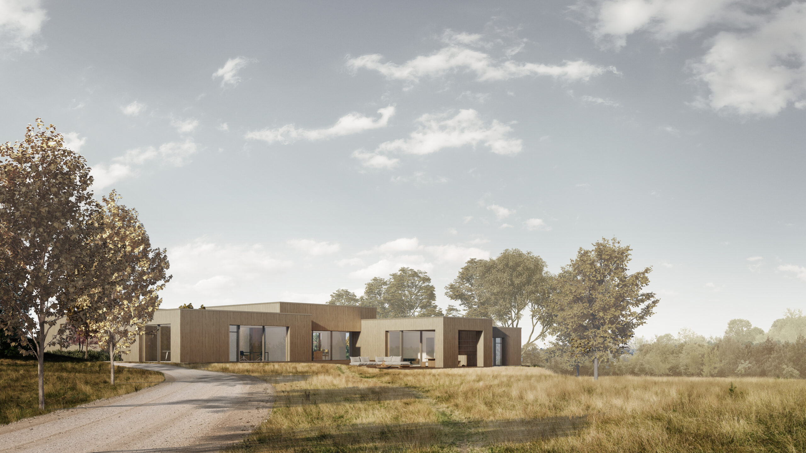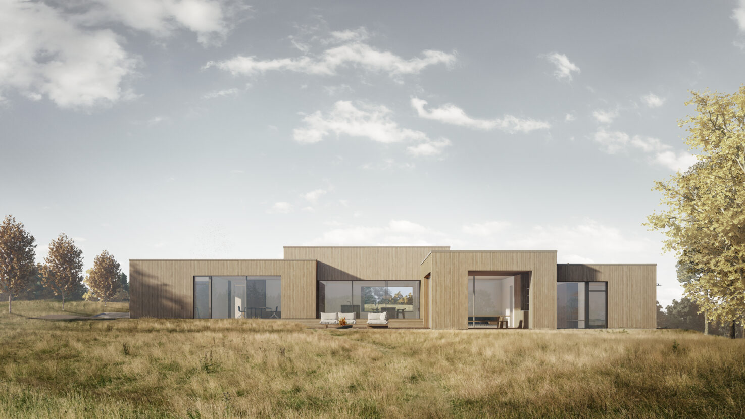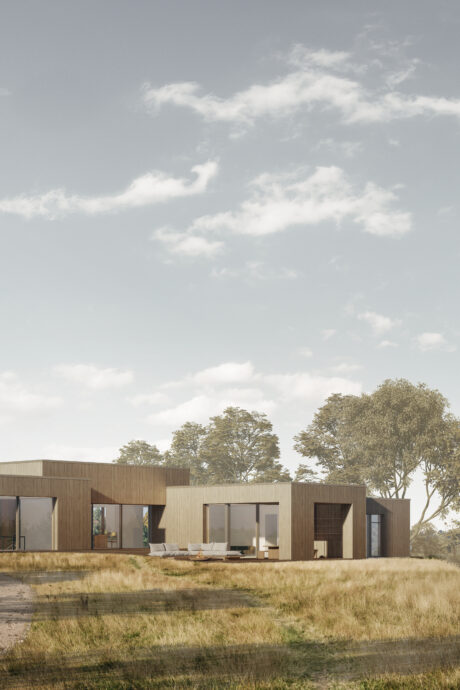 Træfacaderne og terrasserne, der med tiden naturligt patinerer gråt, indskriver huset smukt i sine omgivelser. Indendørs skaber gulve og interiør i eg og beton varme og taktile overflader, der viderefører naturens stemning ind i hjemmet. Store rammeløse skydedøre lader desuden inde og ude flyde ubesværet sammen.
