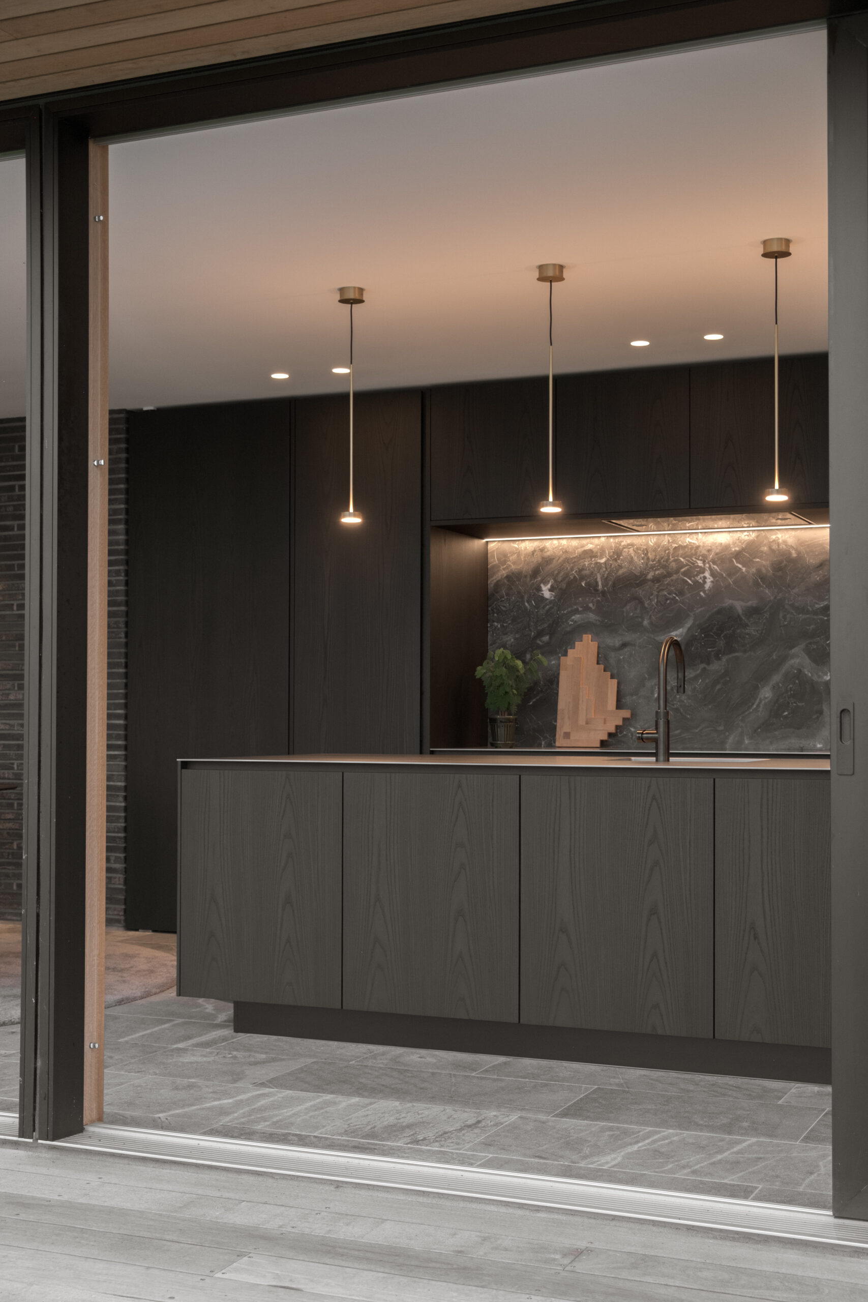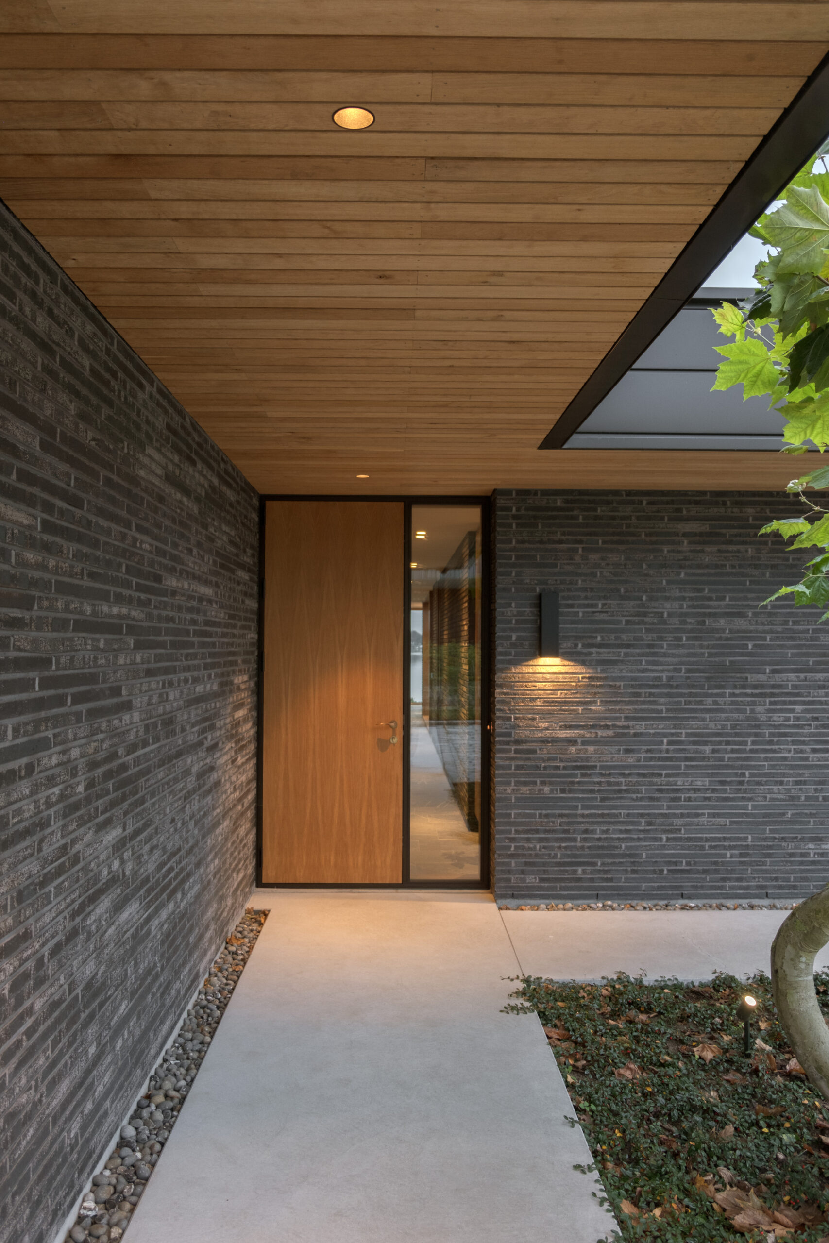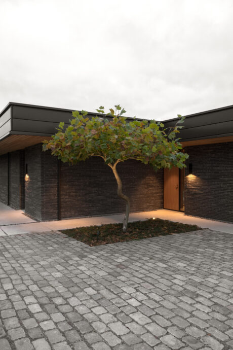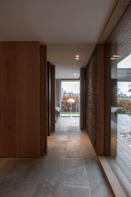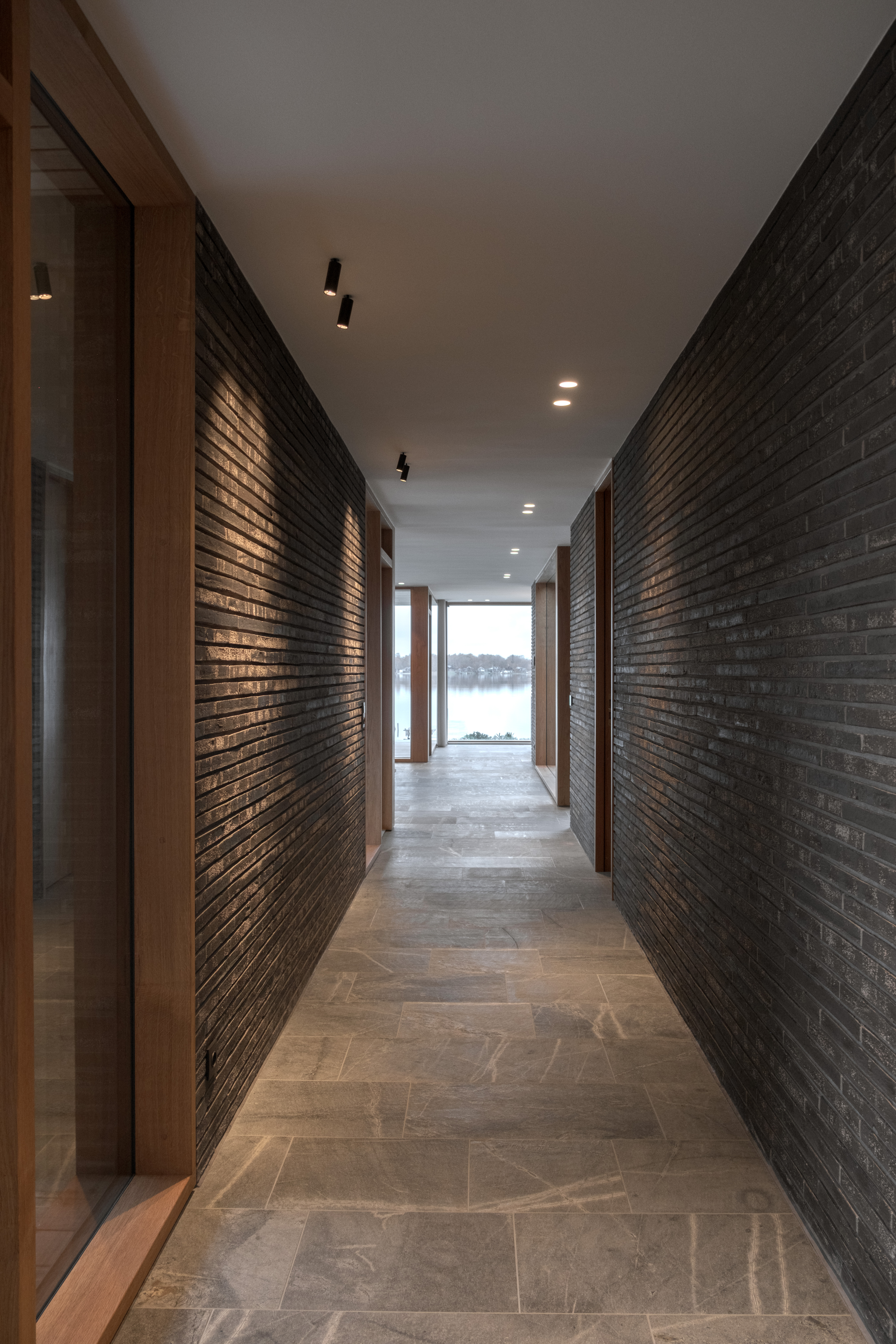 Ved ankomst fremstår villaen afskærmet med gennemgående teglskiver der brydes af garageportens træflade. Man ledes naturligt til den overdækkede ankomst, og fra entréen åbner både husets centrale gårdrum og viewet mod søen sig.