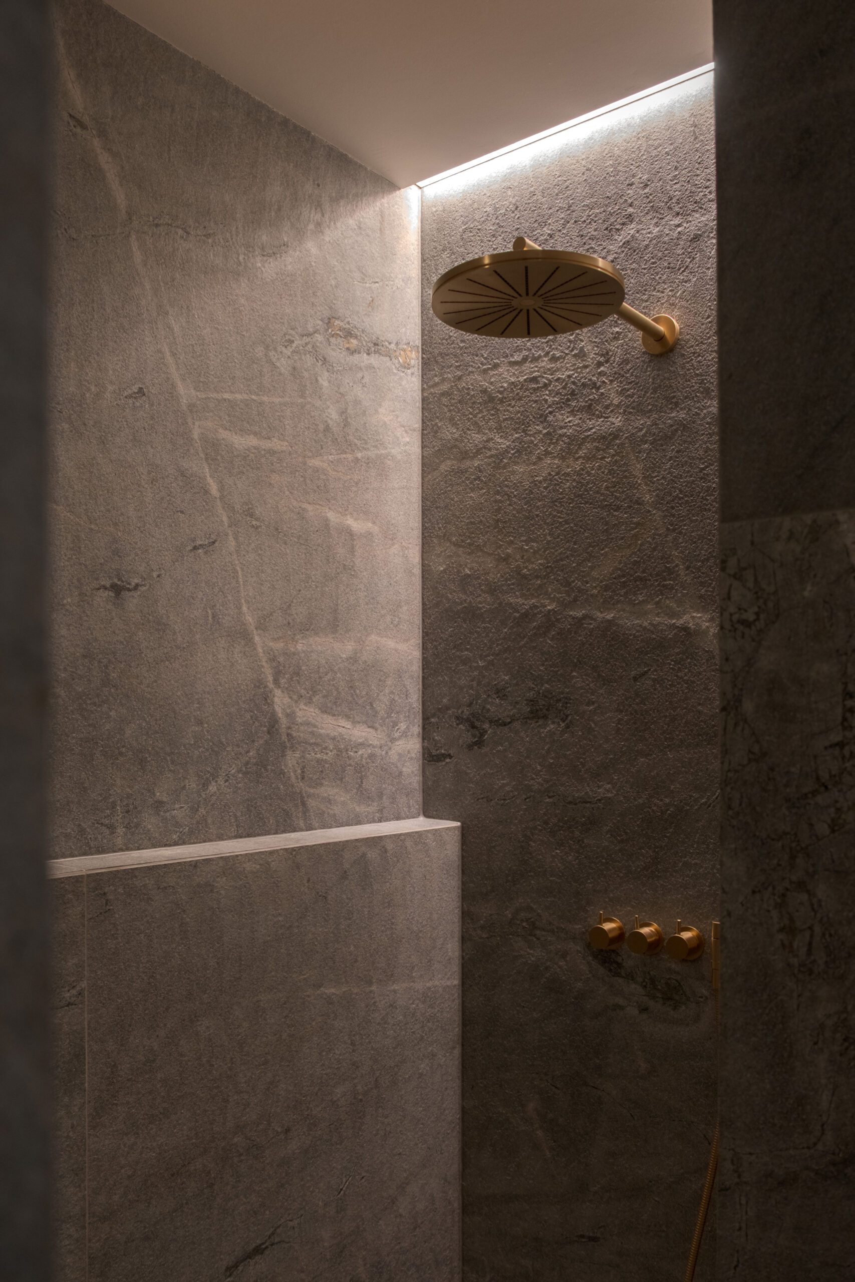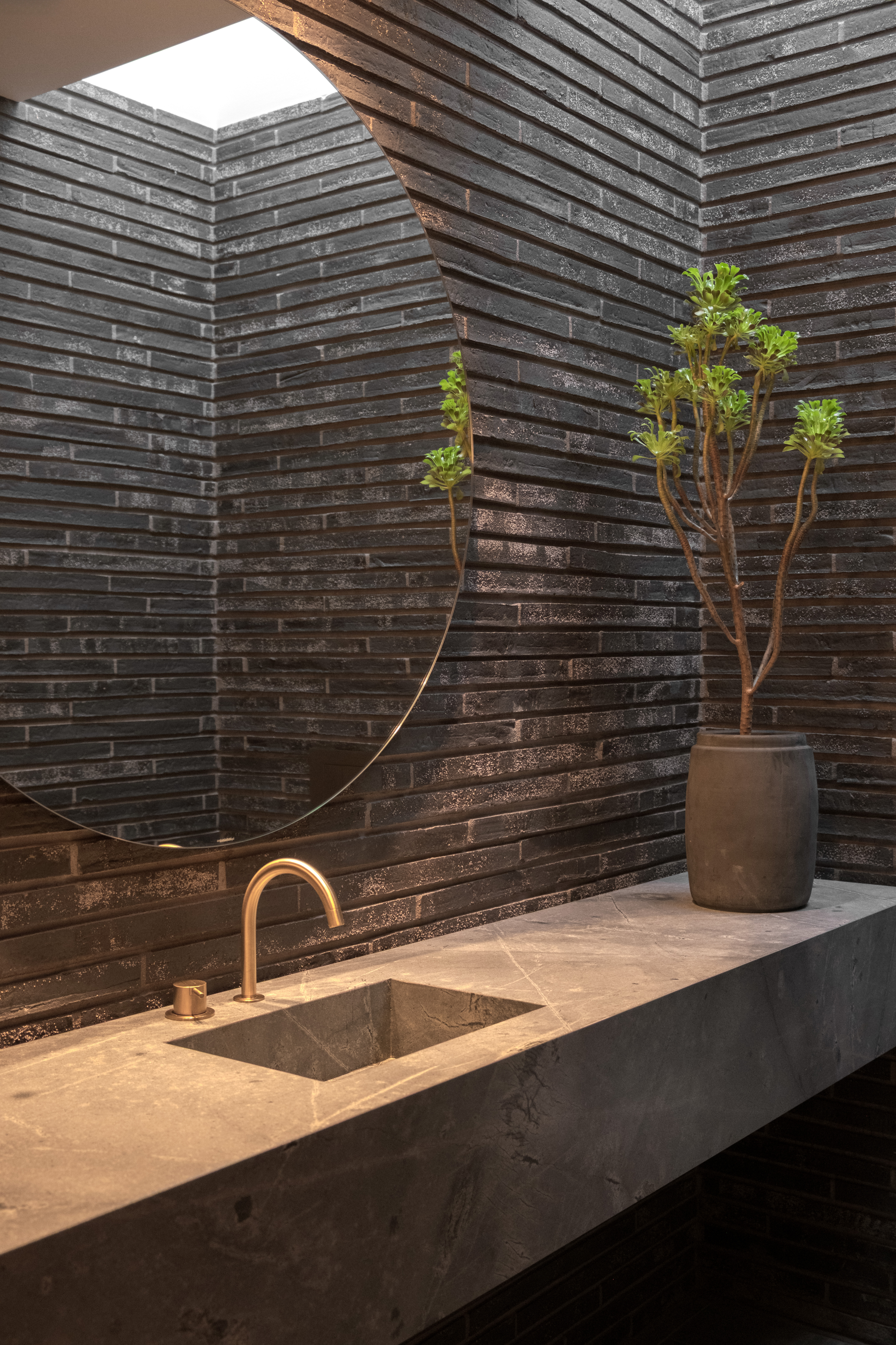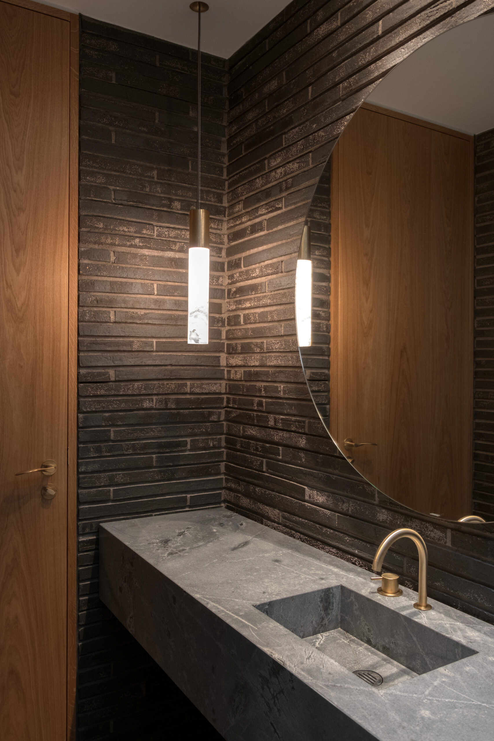 Ved ankomst fremstår villaen afskærmet med gennemgående teglskiver der brydes af garageportens træflade. Man ledes naturligt til den overdækkede ankomst, og fra entréen åbner både husets centrale gårdrum og viewet mod søen sig.