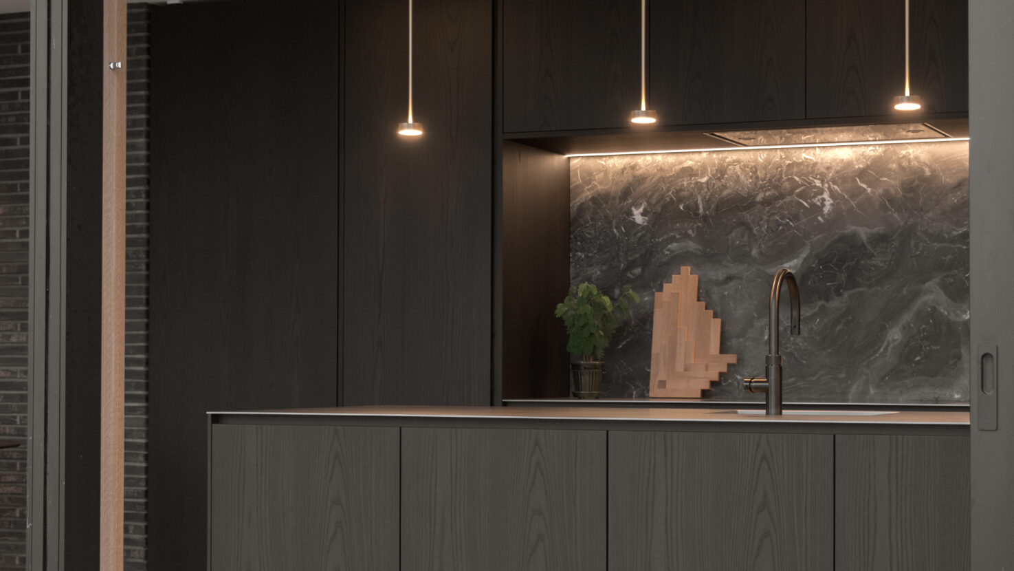 Villaens gårdrum er boligens omdrejningspunkt, som skaber spændende kig på tværs af boligen. Stue og køkkenalrum er trukket frem mod søen og udsigten, mens masterafdelingen ligger tilbagetrukket med gårdrummet som den primære udsigt.