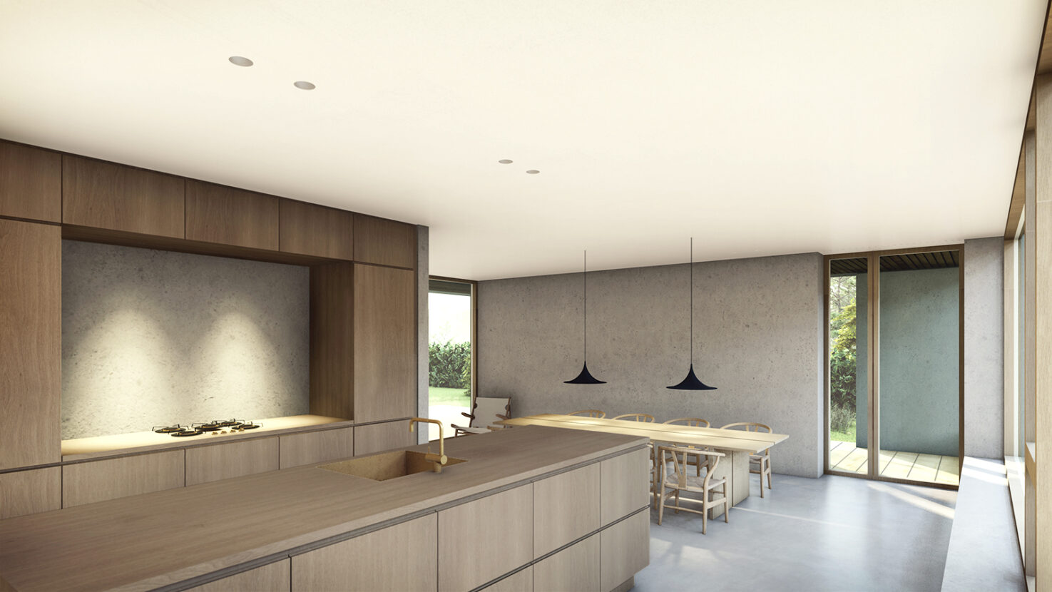 På en skrånende grund, der falder ned mod et fredet naturområde med en mindre bæk, vildt krat og store træer, ligge Villa Rønbæk. En væg skærmer mod trafikeret vej i hele grundens bredde, kun afbrudt af en enkelt åbning til carport og ankomst. Bag denne åbner der sig et privat rum til udeophold med overdækket terrasse, mens boligens leverum primært orienterer sig mod udsigten fra nordvest til nordøst. I parterreetagen ligger boligens soverum, der alle har direkte forbindelse og udgang til haven og naturen lige udenfor døren