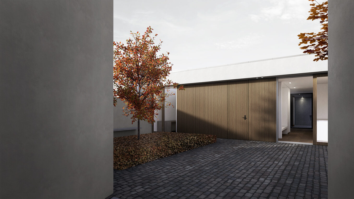 Walled Garden House skærmer sig bag den høje og markante mur og lukker sig på den måde omkring sig selv med en stor privathed. Garagen danner et volumen som lukker af mod vejen og flankeret af villaen opstår rammerne omkring en smuk gårdhave. Villaen åbner sig med store glaspartier fra opholdsstue, køkken og orangeri mod både gårdhaven og den lukkede have.